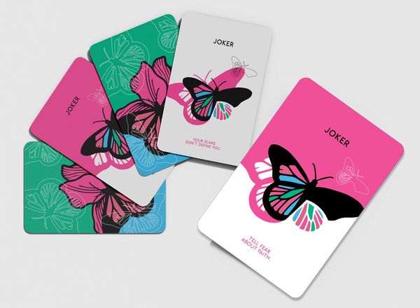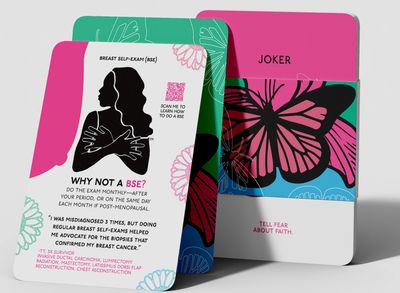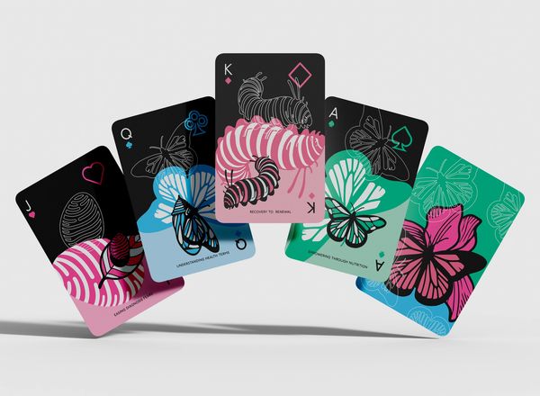 The deck used Indie and Avenir typefaces to craft a visual narrative that paralleled the life cycle of a monarch butterfly, symbolizing transformation and renewal. Each suit represented a phase of the breast cancer journey, with carefully selected typography, colors, and floral motifs reinforcing themes of guidance, empowerment, and healing. This thoughtful design approach created a sensitive yet uplifting tool, providing both information and reassurance.